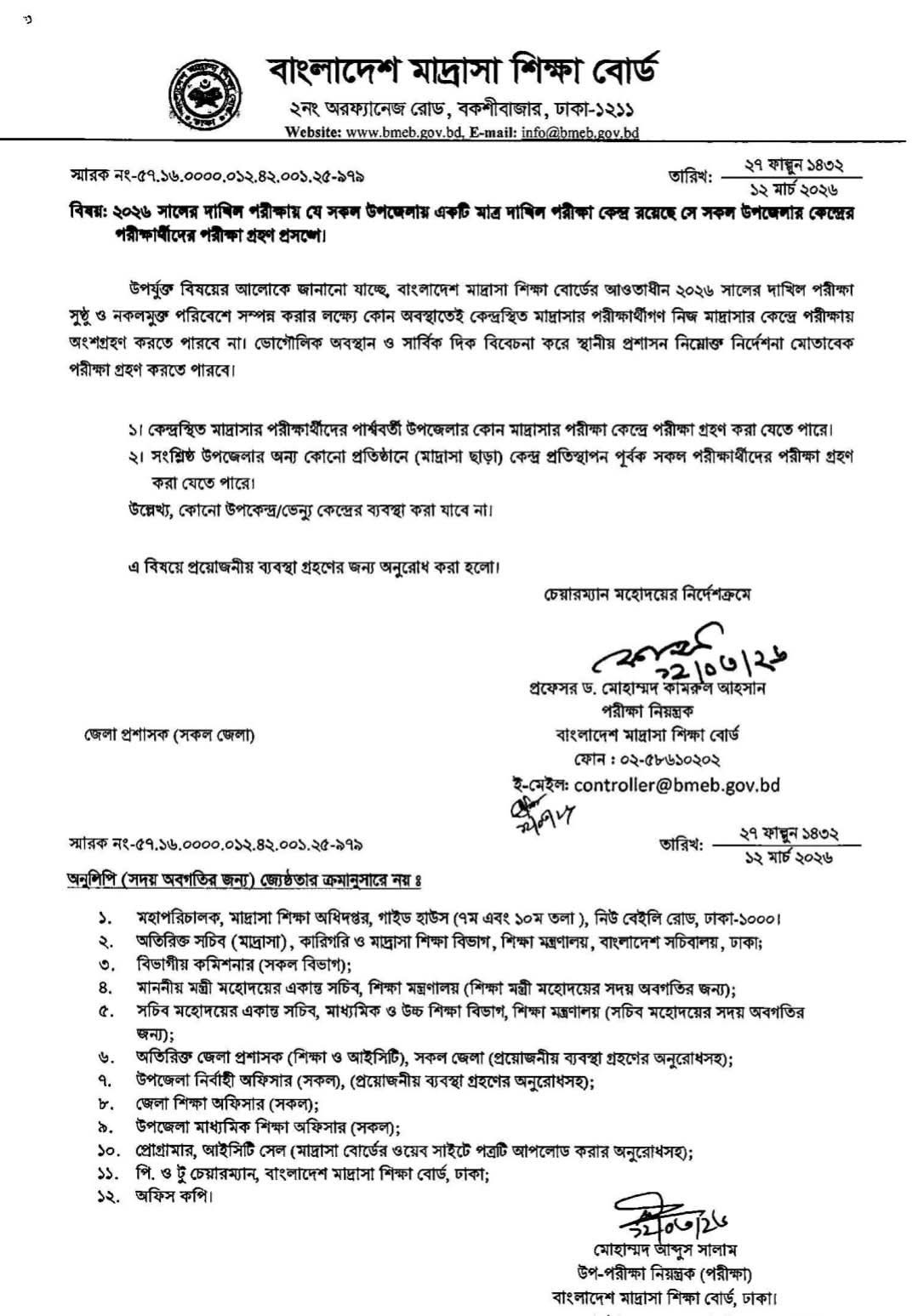দাখিল পরীক্ষা --২০২৬ এর কেন্দ্র বিষয়ক বিজ্ঞপ্তি